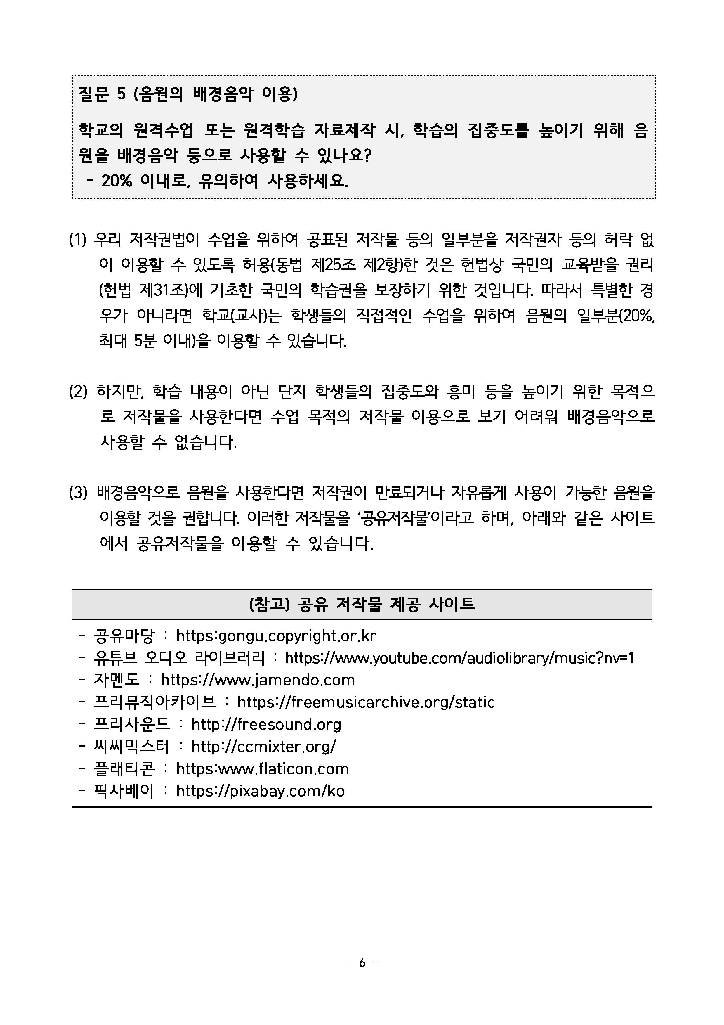학교의 원격수업 또는 원격학습 자료제작 시 학습의 집중도를 높이기 위해 음 , 원을 배경음악 등으로 사용할 수 있나요?