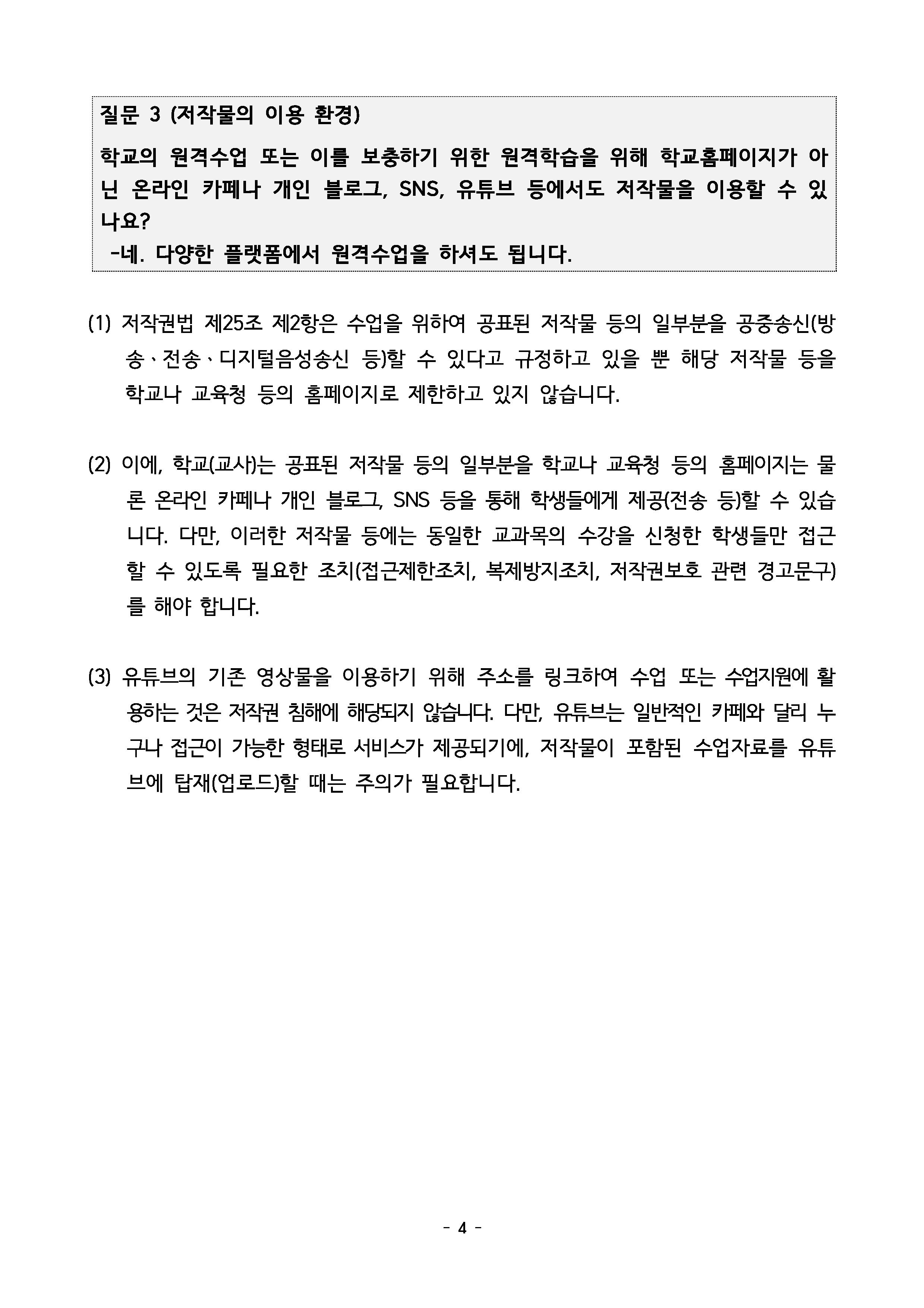 (3) 유튜브의 기존 영상물을 이용하기 위해 주소를 링크하여 수업 또는 수업지원에 활 용하는 것은 저작권 침해에 해당되지 않습니다. 다만, 유튜브는 일반적인 카페와 달리 누 구나 접근이 가능한 형태로 서비스가 제공되기에, 저작물이 포함된 수업자료를 유튜 브에 탑재(업로드) 할 때는 주의가 필요합니다.