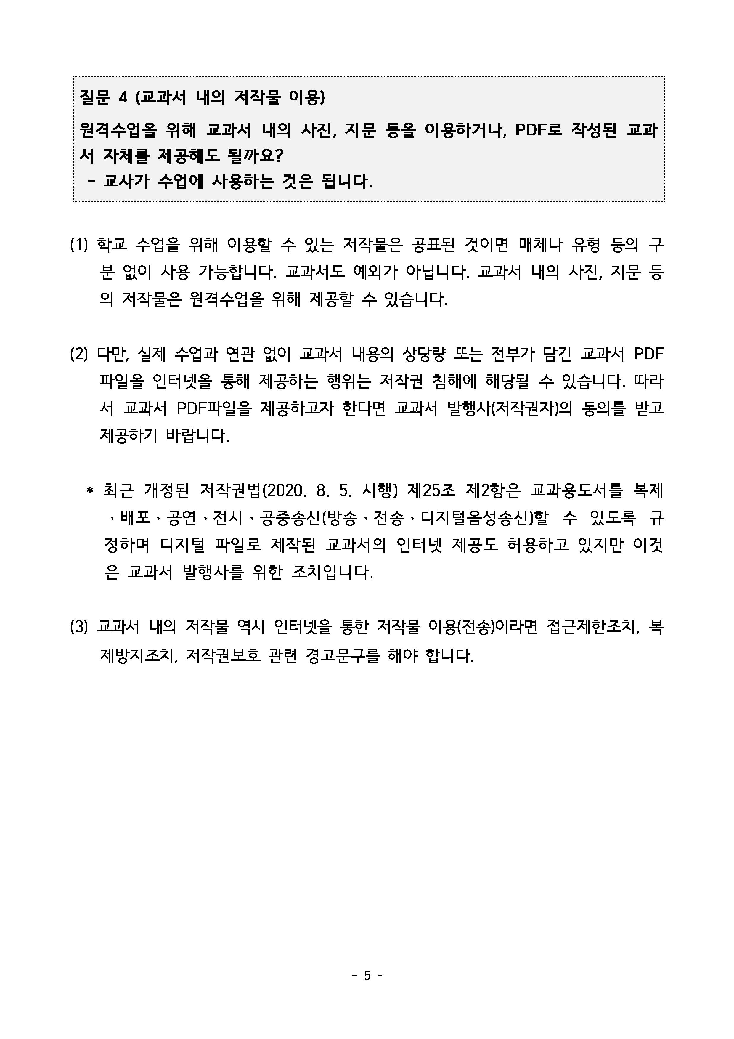 원격수업을 위해 교과서 내의 사진, 지문 등을 이용하거나 PDF로 작성된 교과서 자체를 제공해도 될까요?