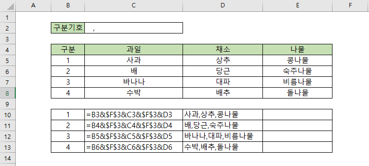위와 같이 각 셀을 &로 연결하여 구분기호를 중간에 넣고 합치는 방법이 가장 일반적인 방법입니다.