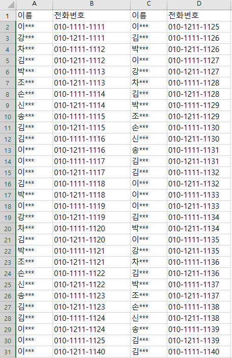 우선 엑셀의 전화 목록을 위와 같이 30개 단위로 끊어서 분류 합니다.